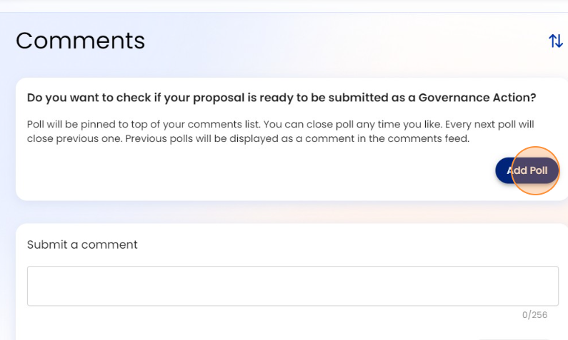 10. Before submitting the proposal as a Governance Action, it is recommended to add a poll as a temperature check. To do this, click on "Add a poll."
