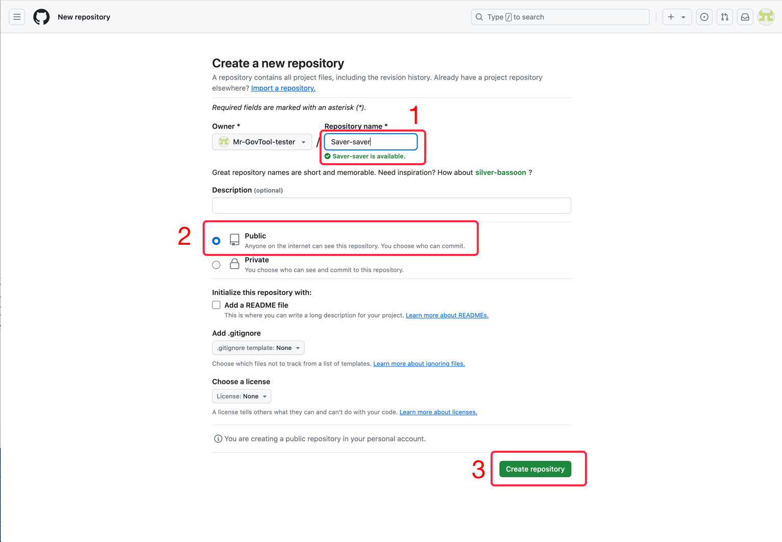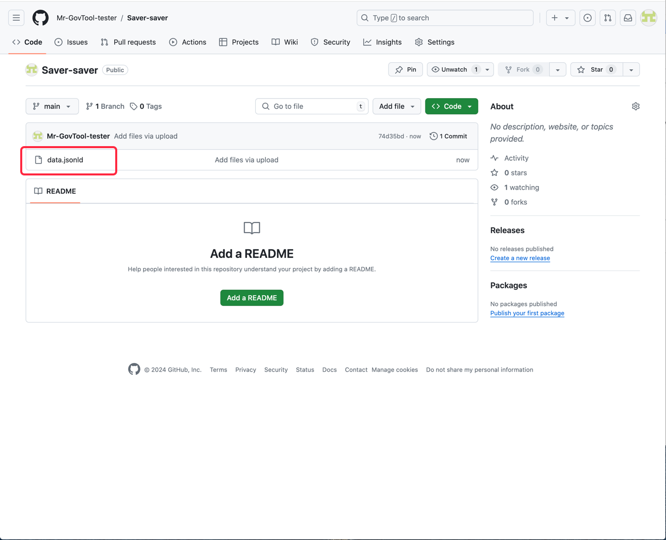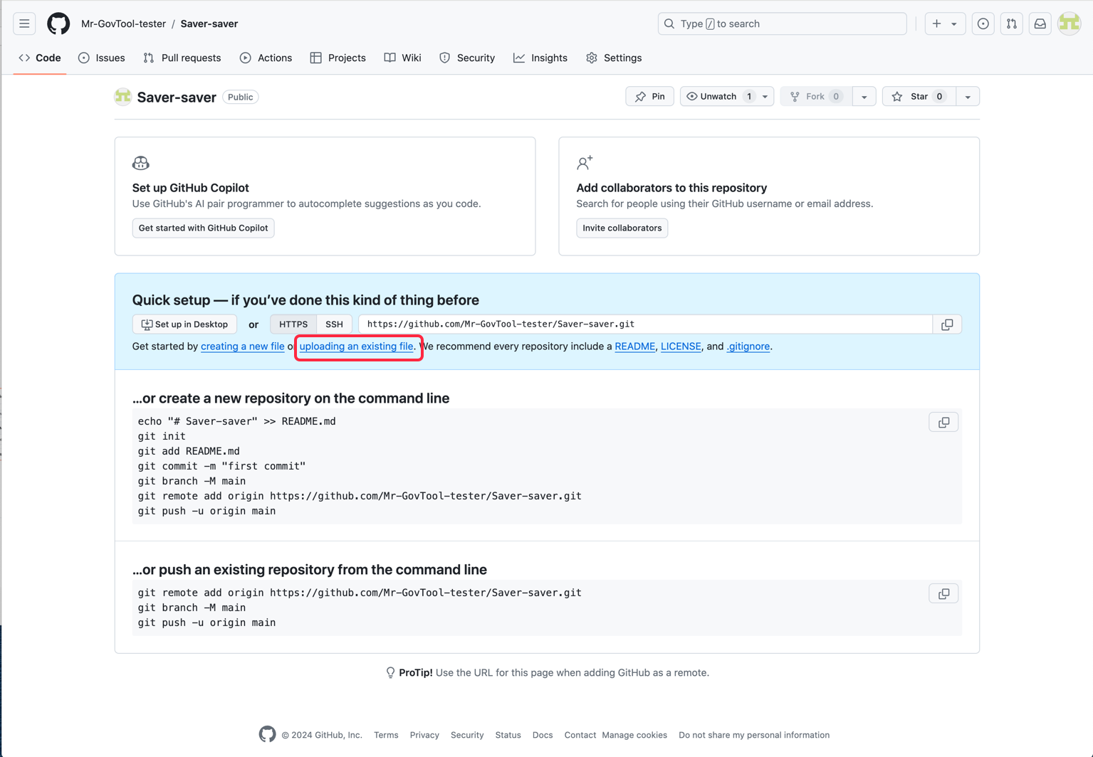 9. Now you have a public GitHub repository of your own!. In the example below, the repository is called "Saver-saver". You will need to upload the data.jsonld file that you got from GovTool now. Click the link "uploading an existing file"<br>