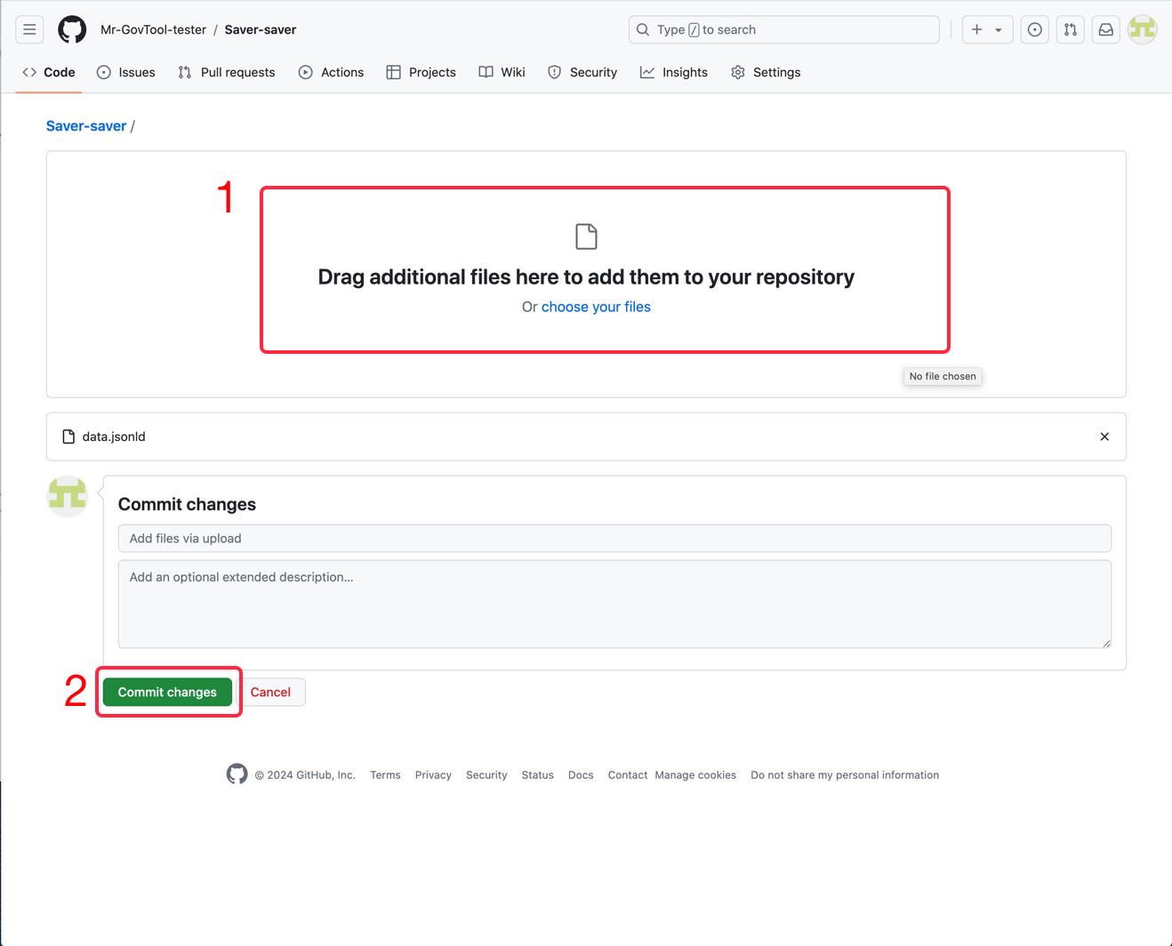 10. Upload the "data.jsonld" file to GitHub by drag-and-dropping it or choosing it from your computer. Click the "Commit changes" button. This will add your file to GitHub and put it in your repository.<br>