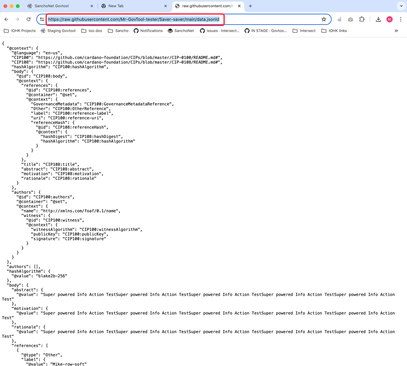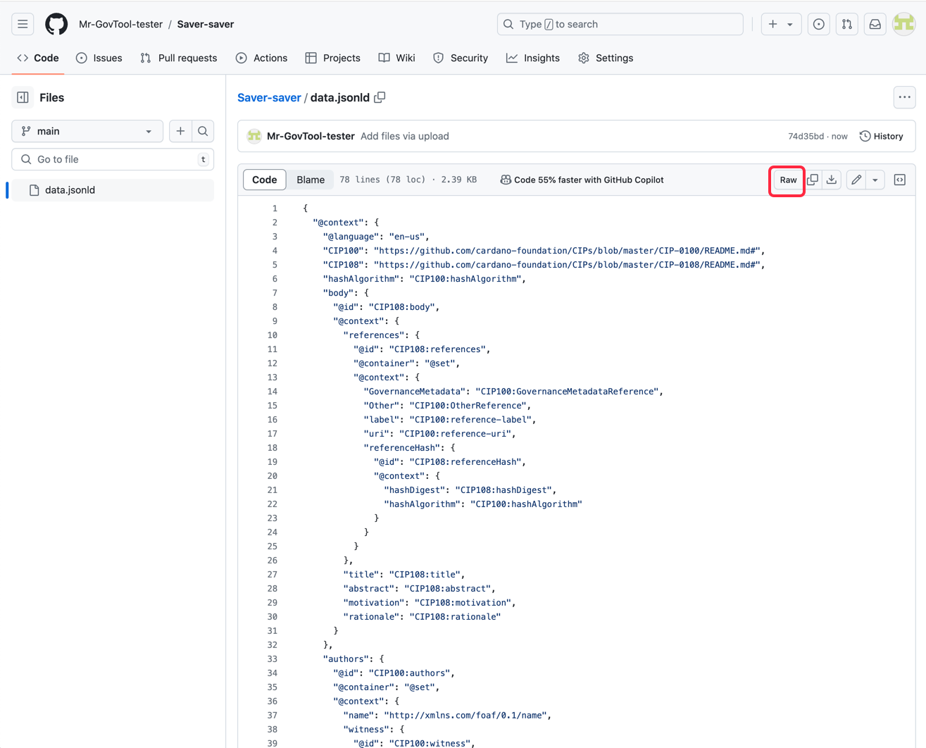 12. This will display the file contents. You now need to get a URL to paste into GovTool. To do this, click the "Raw" button above the code.<br>