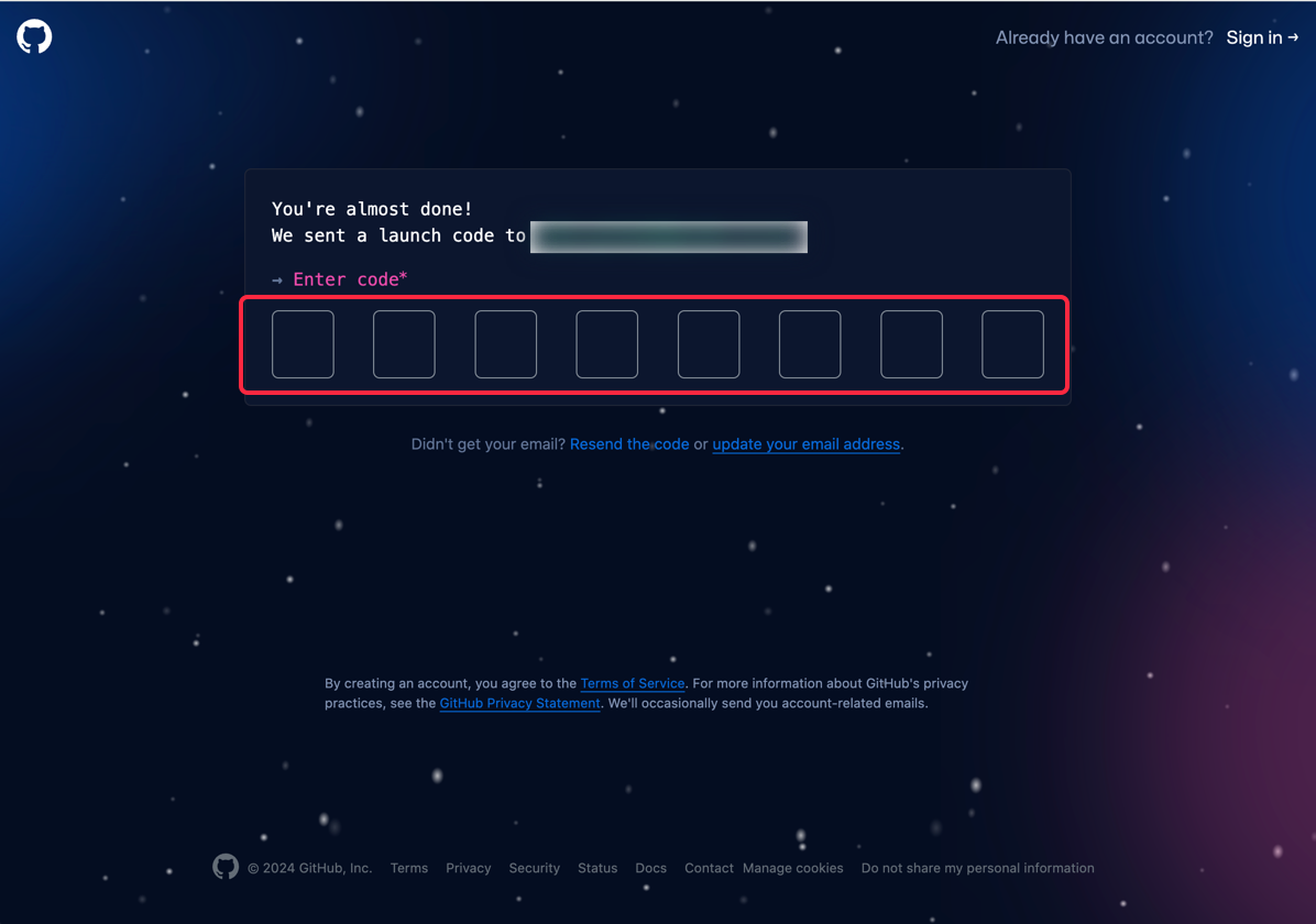 7. GitHub will send you a confirmation code to your email inbox. Find it and enter it here.<br>