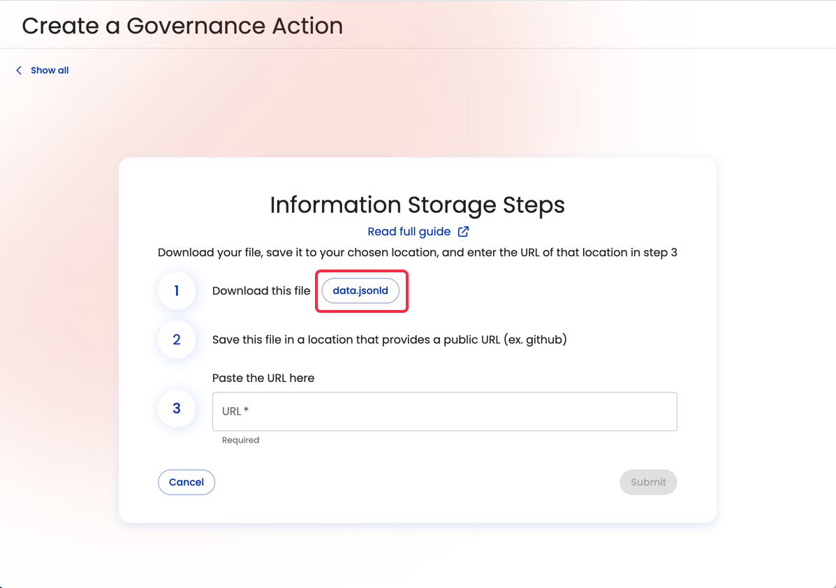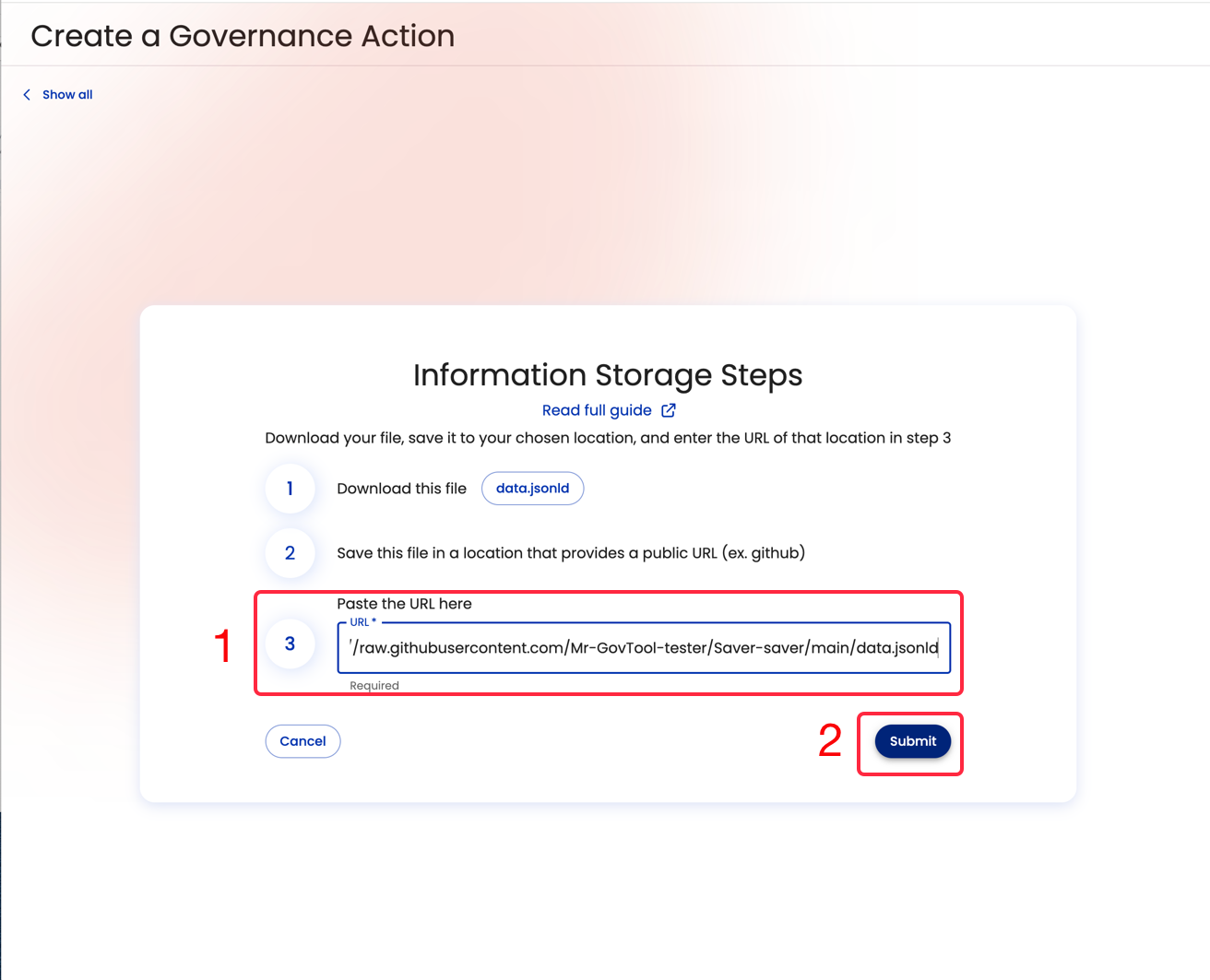 14. Return to GovTool, paste the URL into the URL field, and click "Submit"<br>